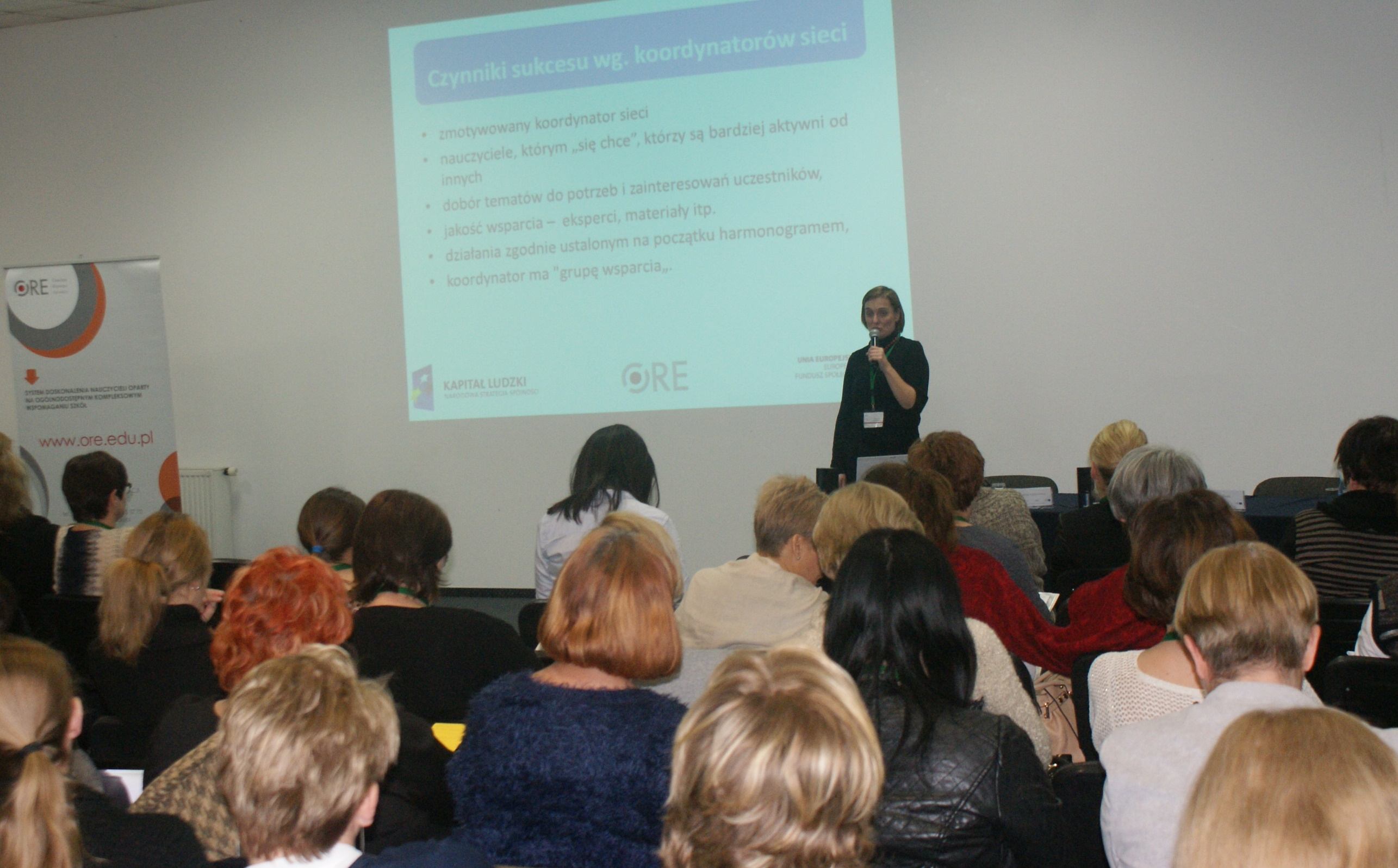 „Podstawowym zadaniem była diagnoza potrzeb nauczycieli. Współpracowaliśmy z osobami, pełniącymi funkcje SORE. Potem wykorzystując pomysły wypracowane w sieci, nauczyciele pracowali ze swoimi radami pedagogicznymi” — Alicja Sikora, koordynatorka sieci z Krakowa, pokazała jak łączyć wspomaganie szkół z doskonaleniem nauczycieli.